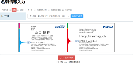 名刺の部署、役職、電話番号、E-mailなどのデータ入力・修正・削除はお客様が行い、画面に表示されるプレビューで確認して発注する事といたします。